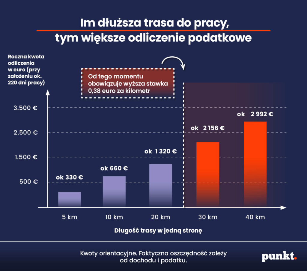 Dla osób dojeżdżających krótsze dystanse, np. 10 km, zwrot będzie mniejszy, ale nadal może znacząco obniżyć podatek, szczególnie jeśli przekroczysz kwotę bazową wydatków.